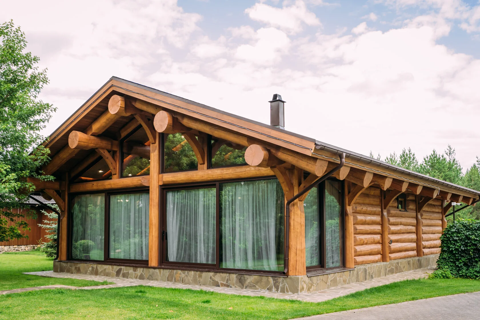 Просторная баня с открытыми бревенчатыми конструкциями кровли в интерьере и панорамным витражным остеклением в комнате отдыха.